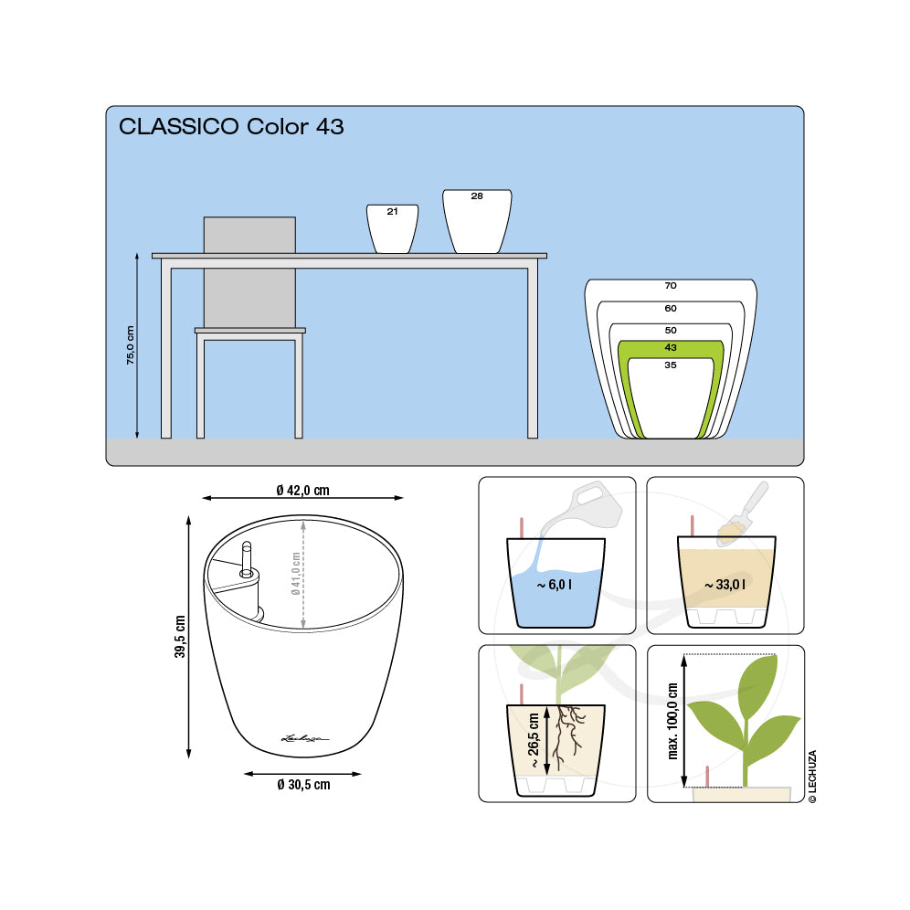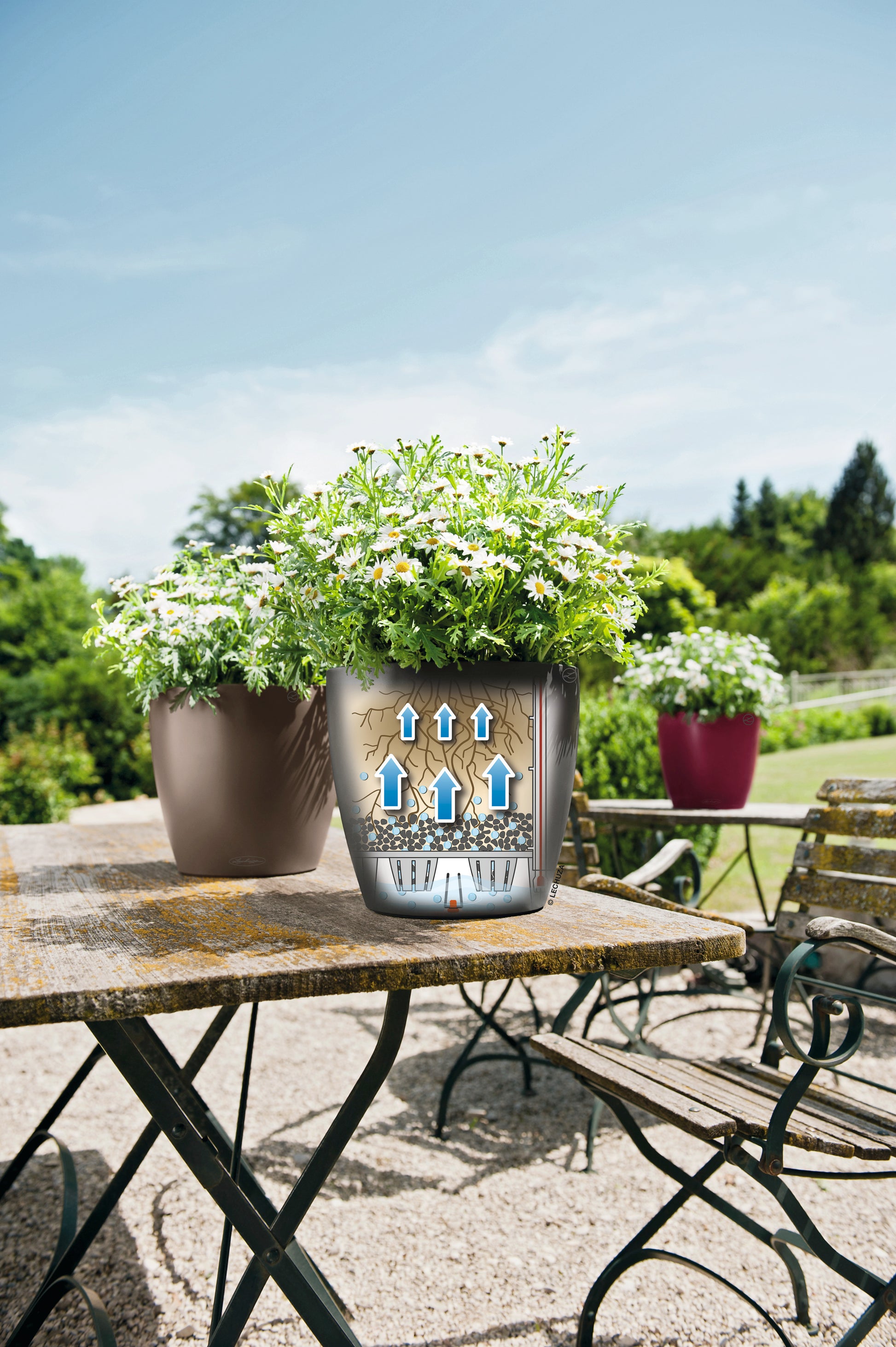 The CLASSICO Color family shows off an aesthetic appearance, high-quality design and smart functionality. Thanks to the reliable LECHUZA soil irrigation system, the plants can take as much water and nutrients as and when they need it and, in outdoor areas, the removable bottom screw protects against waterlogging in heavy rain.
