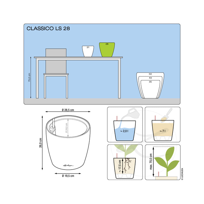 This high-quality CLASSICO Premium LS planter by Lechuza is made of shatter-proof, UV-resistant polypropylene. Thanks to the classic shape, the planter is suitable for every living area. The patented liner system makes it easy to replace the plants.