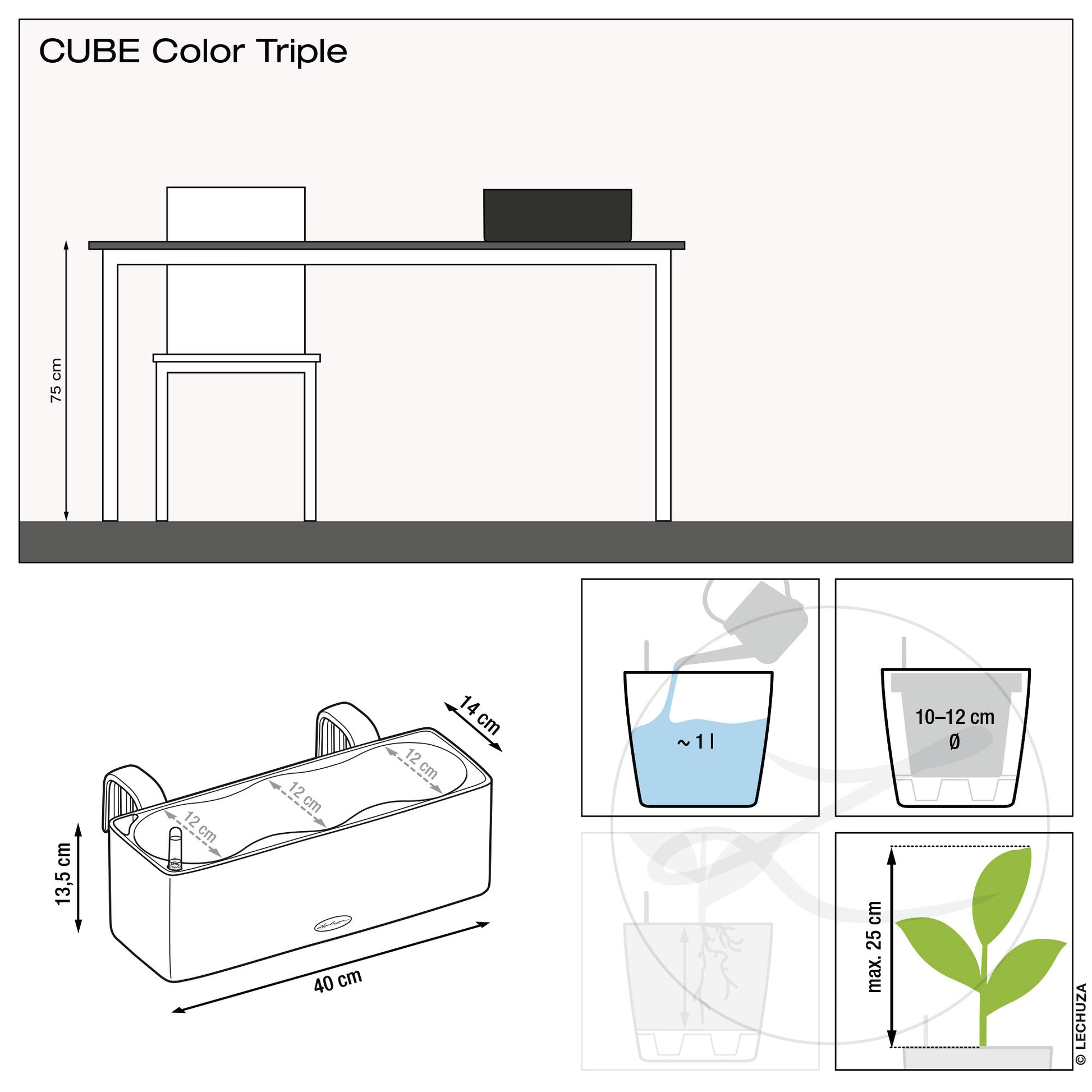 For relaxed plant care without daily wateringThe LECHUZA irrigation system takes the stress out of plant care. Plants can easily be placed in the containers of the CUBE Color Triple, together with the grow pot, without the need for time-consuming repotting. A stick inserted into the grow pot from below transports moisture evenly to the roots. The water level indicator can then be used to check when it is time to fill up the reservoir again. Plant care can be that simple!