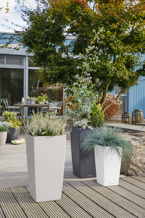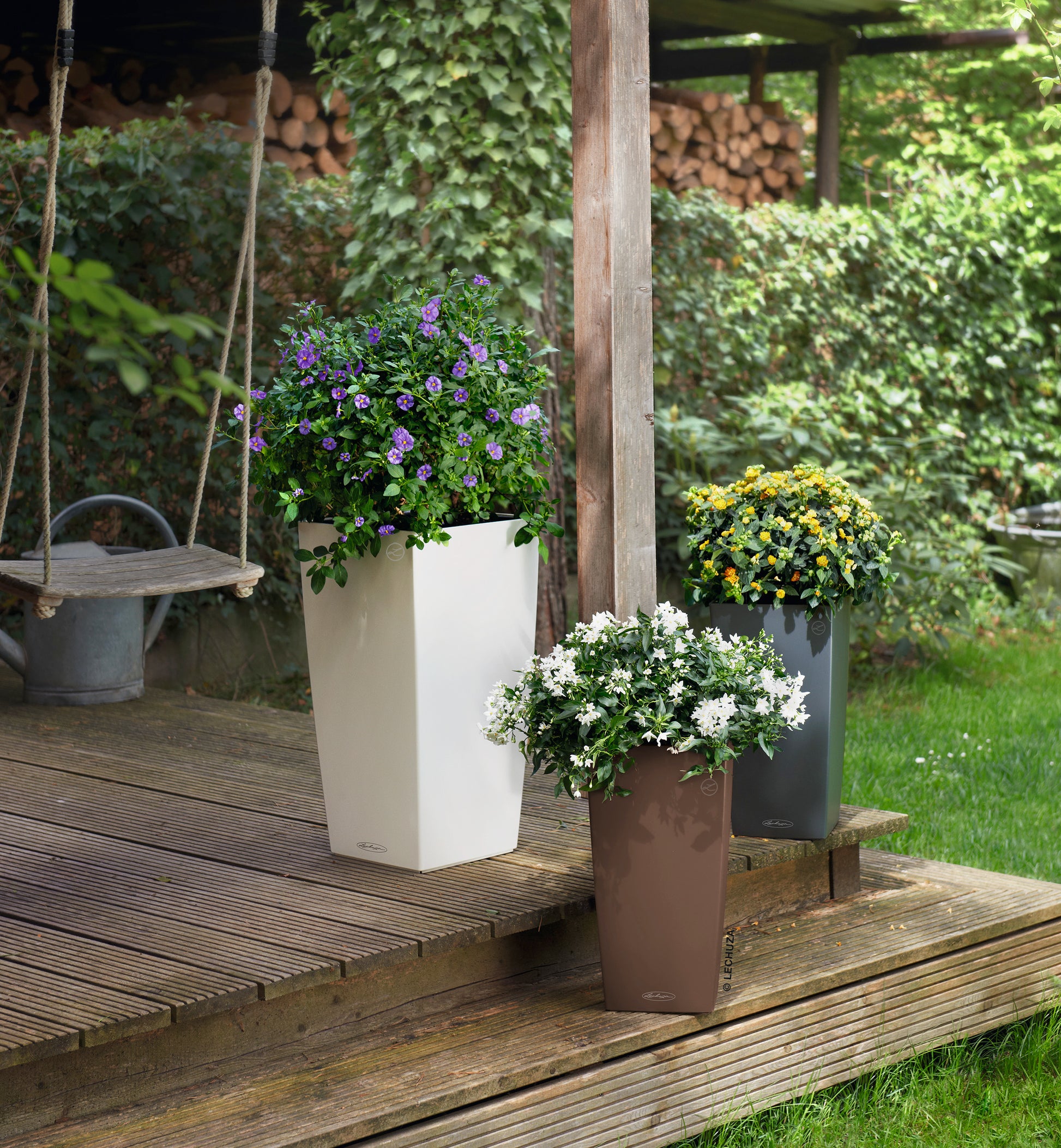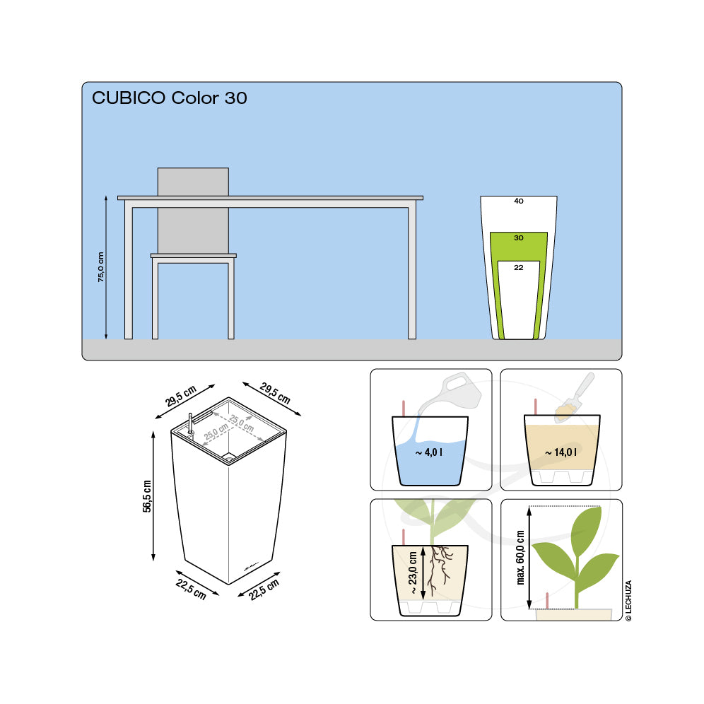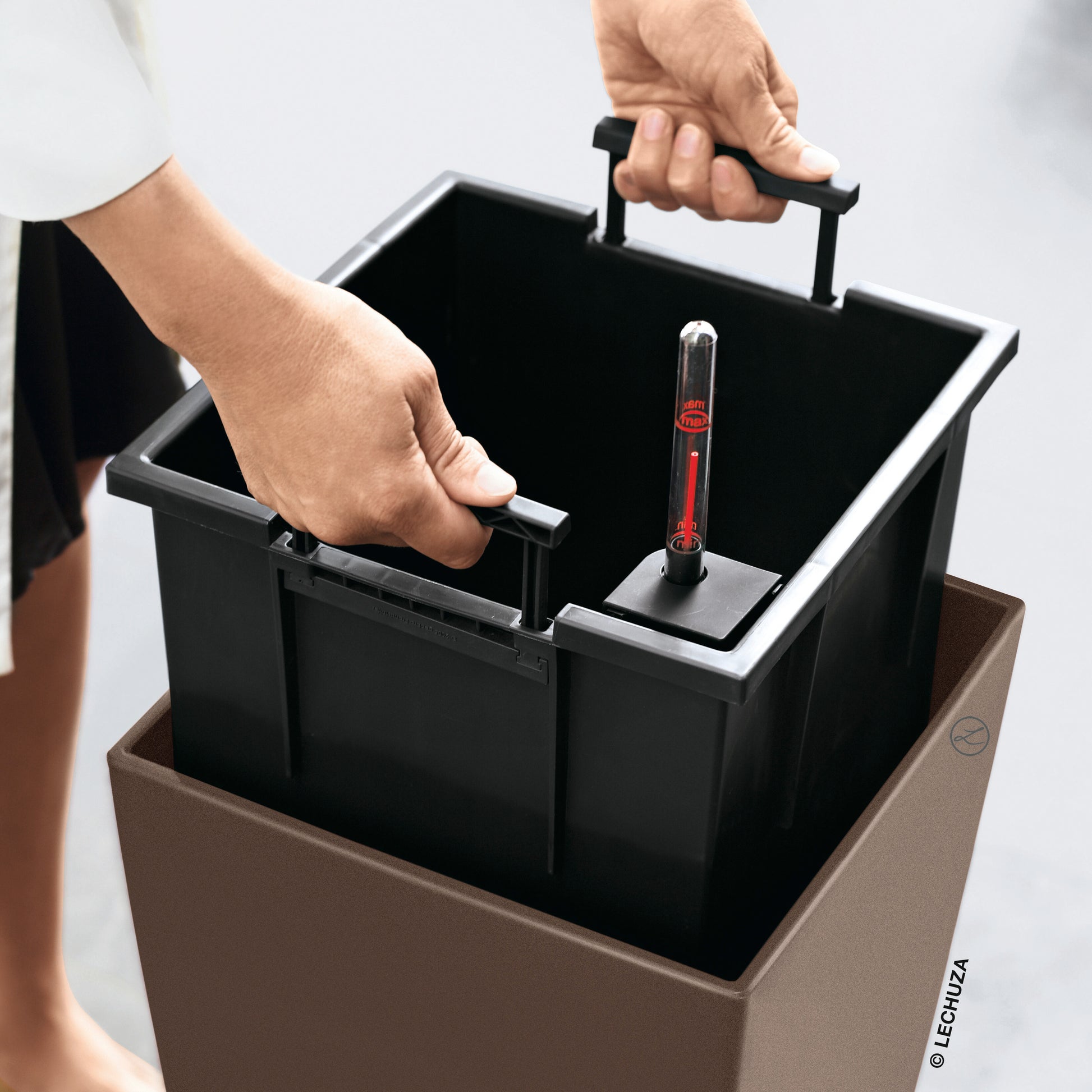 The planter's water-level indicator, which shows when the reservoir needs to be refilled, allows easy monitoring of the water reservoir levels, taking the guesswork out of plant care. Also included with this planter is LECHUZA's specially-formulated plant substrate, LECHUZA-PON which separates your potting soil from the water reservoir, aerates the roots, provides your plants with nutrition and helps regulate the water supplied to your plant. As an indoor and outdoor planter, the CUBICO Color is outfitted with a drainage plug to allow for the removal of excess rainwater when installed outdoors. This feature makes the CUBICO Color ideal for annuals, blooming plants and foliage.