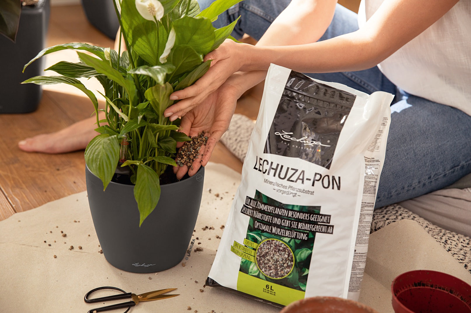 When planting in LECHUZA-PON you don't have to free the root ball completely from soil.