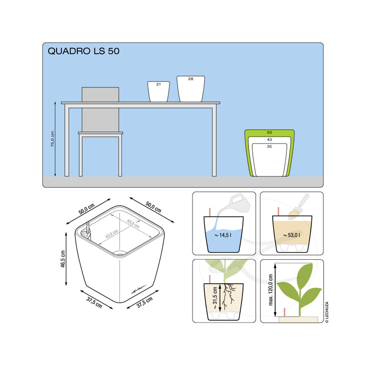 QUADRO LS captivates with its puristic design in five different sizes, which make numerous design ideas possible: as table decoration with changing plants in the QUADRO LS 21, the QUADRO LS 43 as a new home for the large golden fruit palm for your own Urban Jungle or the QUADRO LS 50 as greernery of a hotel lobby. With the QUADRO LS, there are no limits to the design possibilities: QUADRO 43 and 50 are also mobile when planted, thanks to additionally available roller coasters. Thanks to the patented, retractable handle frames, changing the plants and plant care is also a child's play.